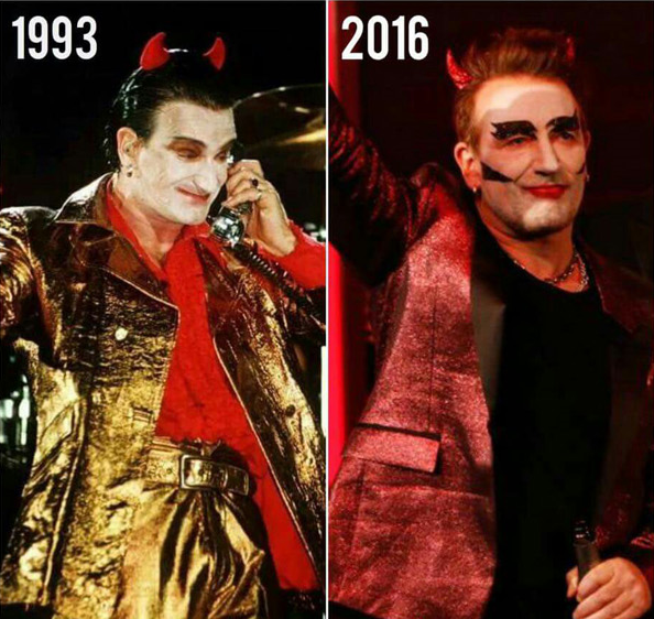 Debajo de la primera fila , Bono besando a Adam Clayton; tercera fila , haciéndose pasar por un demonio al interpretar como el Sr. MacPhisto.