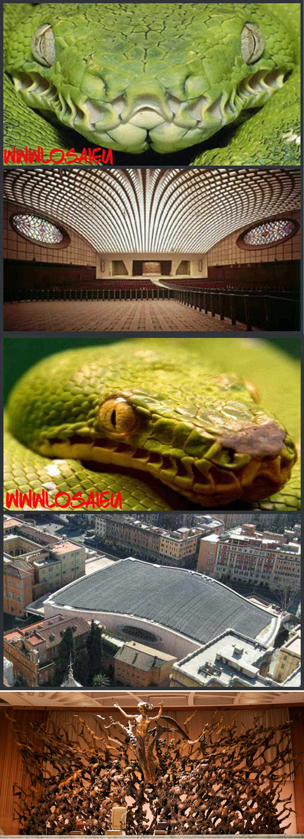 Un mensaje reciente de uno de nuestros lectores llamó nuestra atención sobre esta perspectiva serpentina del Salón Pablo VI, que hasta ahora había escapado a nuestro radar. Una búsqueda paralela nos llevó a un video de 3 minutos que se enfoca en estas y otras analogías entre la arquitectura de este Salón y la forma de una serpiente. Aunque no apoyamos todas las sugerencias del autor, es un estudio digno de atención.
