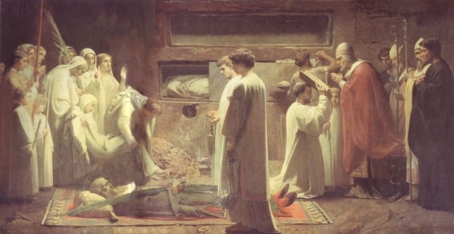 Es lo que la Iglesia Romana ensayó desde las Catacumbas. En todas partes enterraban los católicos a los hermanos difuntos, aun a los no mártires, al son de himnos y salmos y entre el suave murmullo de las plegarias, ofrecían por ellos el Santo Sacrificio, y los inscribían en los dypticos para recordarles con frecuencia en sus reuniones religiosas.