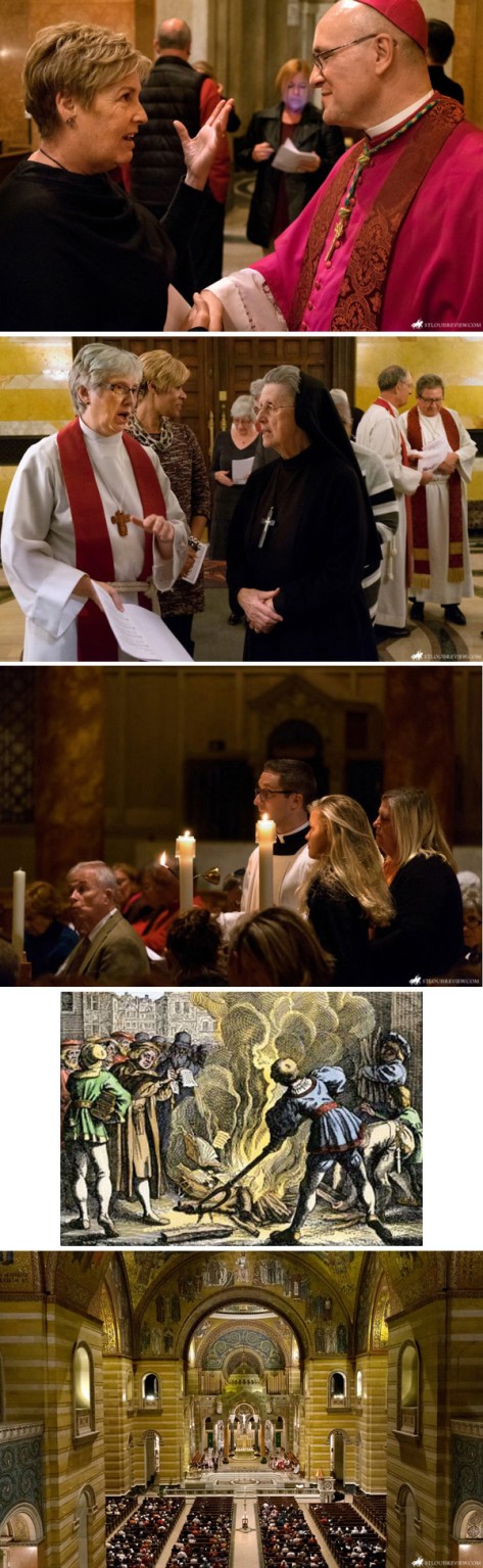 Primera fila abajo, El «Obispo «Auxiliar Massa saluda a un participante después del servicio conjunto; segunda fila , el «pastor» luterano Kendra Nolde instruye a Hna. Mary Kathleen Ronan antes del servicio; tercera fila,adoradores encendiendo velas para simbolizar la supuesta unidad; cuarta fila , Martin Luther en Wittenberg quema la Bula de excomunión del papa León X en 1521. Última fila , una descripción general del público presente.
