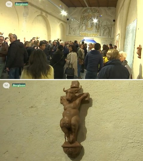 En la parte superior del artículo, informamos que la Iglesia San Juan Bautista estaba siendo profanada por el moderno «arte» de Tom Herck, que presentaba una vaca crucificada rodeada por un charco de 5.000 litros de leche. Esta iglesia no fue el único objeto de la profanación de Herck: la imagen de arriba es una obra más que se exhibió en la Gasthuiskapel (capilla de la casa de huéspedes) de Borgloon, otra iglesia histórica en Borgloon, Bélgica.
