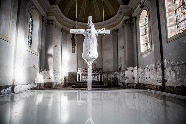 En la imagen de arriba, se ve el cadáver de una vaca real, todo cubierto de pintura blanca, clavado en una cruz. Debajo de la cruz hay un charco de 5,000 litros de leche. Esta obra «artística» titulada Holy Cow se exhibió desde principios de noviembre en la iglesia católica St. John the Baptist de Kuttekoven en Borgloon, Bélgica.