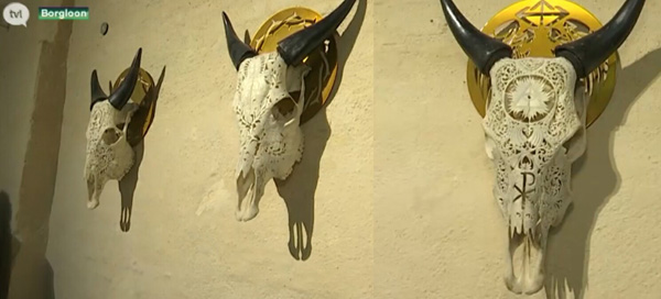 Lo que hace que esta exposición particularmente nefasto es el uso de imágenes demoníaca – tales como los cuernos negros y cráneos de animales ilustrados anteriormente – en combinación con los símbolos católicos como el Christogram (en la parte inferior de la extrema derechacráneo representado anteriormente) Y la pirámide con el ojo de Providence, originalmente un símbolo Católico (ver La última cena en Emaús ), más tarde adoptada por los masones en el siglo 19 .