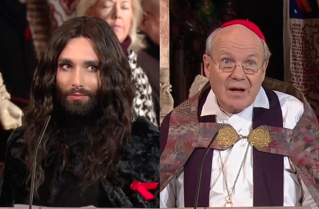 En las oraciones de licitación, el travestí Thomas Neuwirth, que se hace llamar «Conchita Wurst», lamentó una supuesta «persecución de aquellos que viven su identidad de una manera diferente a la de la mayoría». Después, invitó a la gente a subir, poner un grano de incienso en un tazón [!] y ofrecer una petición personal.
