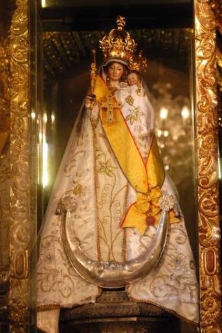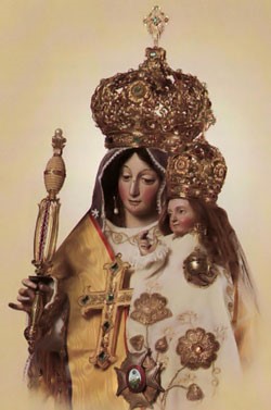 La imagen, que es una fina talla en madera de cedro de unos 62 cm. de alto, está revestida por un amplio y hermoso ropaje de brocado cubierto de gemas, y bordado con hilos de oro y plata que sólo dejan ver su rostro moreno y apacible. La Virgen lleva un cetro en la mano derecha y con la izquierda sostiene el Niño en actitud de bendecir, mientras sostiene una esfera de oro coronada por una cruz.