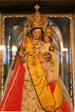 La imagen, que es una fina talla en madera de cedro de unos 62 cm. de alto, está revestida por un amplio y hermoso ropaje de brocado cubierto de gemas, y bordado con hilos de oro y plata que sólo dejan ver su rostro moreno y apacible. La Virgen lleva un cetro en la mano derecha y con la izquierda sostiene el Niño en actitud de bendecir, mientras sostiene una esfera de oro coronada por una cruz.