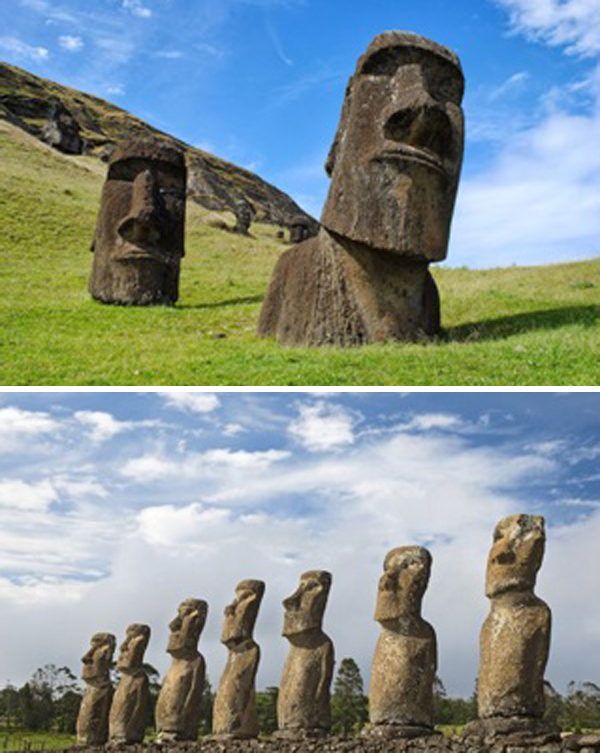 Segundo, las esculturas no parecen ni remotamente humanas. En cambio, parecen dioses paganos primitivos similares a las estatuas Moai de la Isla de Pascua chilena o isla de Pascua, que se muestran a continuación . Esto parece promover un tipo de tribalismo . Por lo tanto, la natividad se presenta más como un antiguo mito pagano, en lugar de la Encarnación de Dios mismo.