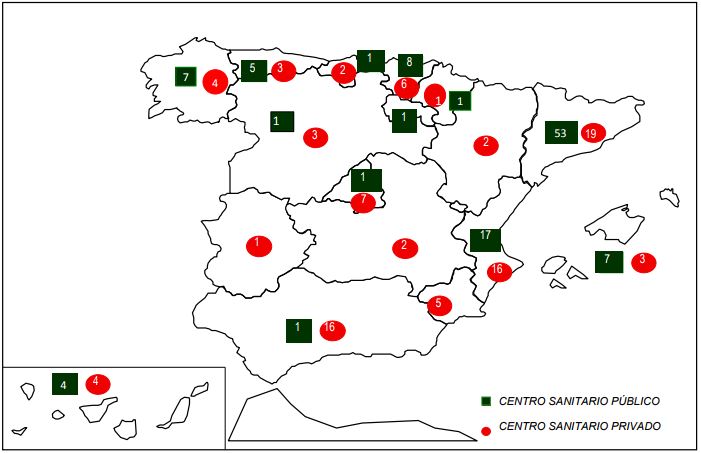 Así, la inmensa mayoría se realiza en los centros extrahopitalarios (89,06%), de los cuales casi todos son de titularidad privada (81,81%).