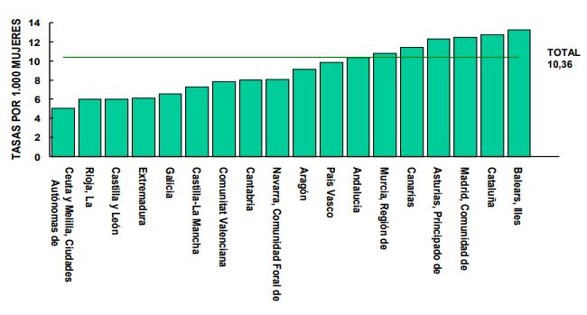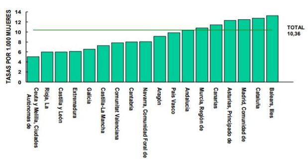 Por Comunidades Autónomas, en tasa por cada mil mujeres en edad fértil (de 15 a 44 años) las regiones donde más abortos se producen son las Islas Baleares (13,30); Cataluña (12,8); Madrid (12,51) y Asturias (12,32).