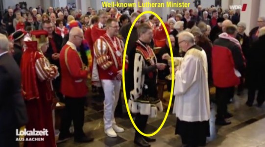 Pero no lo suficiente de la blasfemia, el sacrilegio y la impiedad. El punto culminante se alcanzó cuando el ministro luterano pidió felizmente y recibió la «Sagrada Comunión» junto con los otros tontos: