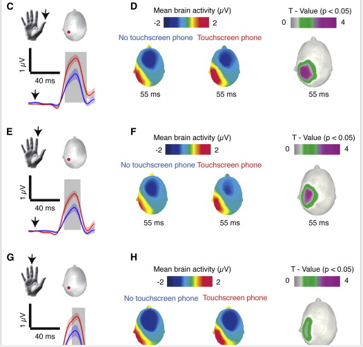Este estudio, que se enfocó en usuarios habituales de teléfonos con pantalla táctil e individuos que utilizan teléfonos con teclas (tecnología anterior), midió la actividad eléctrica de la corteza sensorial distinguiendo entre quienes utilizan sólo los pulgares, los que utilizan el dedo índice o el medio, o ambos a la vez.