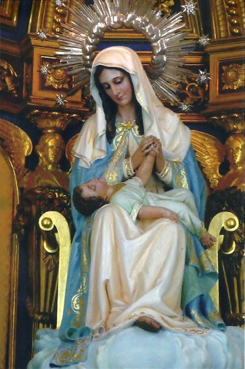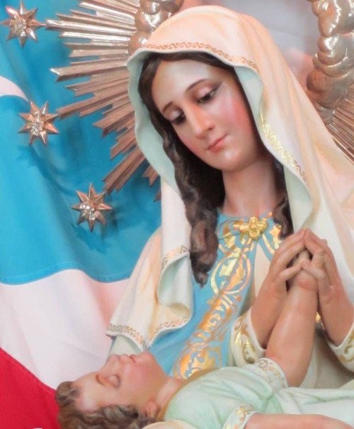 En sus brazos tiene al Hijo de Dios y lo estrecha con amor a su pecho. La mano del Niño Jesús está con la de la Madre y parece que quiere mostrar la fuente sagrada del poder de María.