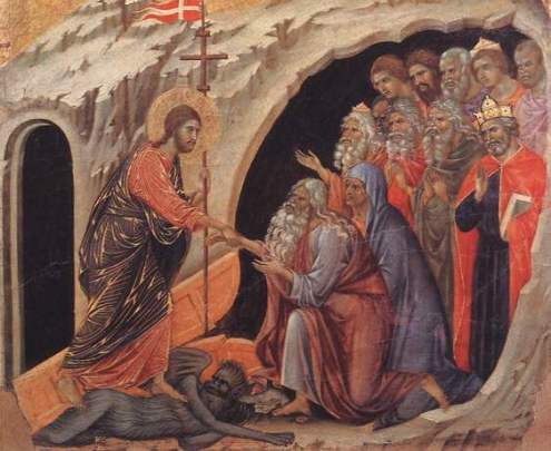 JESÚS EN LOS INFIERNOS. — Habiendo aceptado el Hijo de Dios todas las condiciones de la humanidad, no debía triunfar sino por su Resurrección y no debía abrir las puertas del cielo más que por su Ascensión; su alma separada del cuerpo, tenia que bajar a los «Infiernos» y compartir un momento la mansión de los justos desterrados. «El Hijo del hombre, había dicho, estará tres días en el corazón de la tierra» ‘. Pero en tanto su entrada en estos lugares debía ser saludada por las aclamaciones del pueblo santo, en cuanto debía desplegar su majestad y mostrar el poder y la gloria del Emmanuel. En cuanto Jesús dió su último suspiro en la Cruz, el limbo de los justos se vió de pronto iluminado de resplandores celestiales. El alma del Redentor unida a la divinidad del Verbo, bajó en un instante a estas sombras y de un lugar de destierro hizo un paraíso, es la promesa que al morir hizo Jesús al ladrón arrepentido: «Hoy estarás conmigo en el paraíso.»