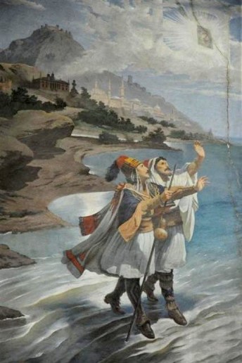 En esa situación de perplejidad, la Virgen del fresco se aparece en sueños a dos valientes soldados de Scanderbeg, llamados Georgis y De Sclavis, para ordenarles que la sigan en un largo viaje. La imagen les inspiraba una gran confianza y arrodillarse a sus pies era motivo de gran consuelo para ellos.