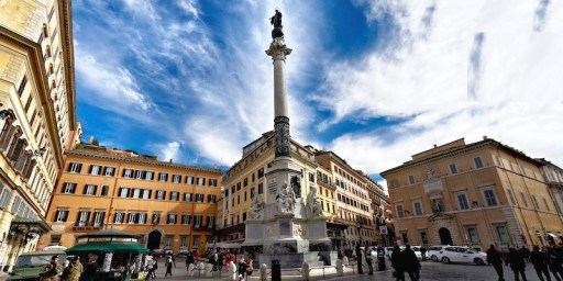 Una de las más bonitas plazas de Roma es la Piazza di Spagna, con la archifamosa Escalinata obra de Alessandro Specchi y Francesco de Sanctis; con la Embajada de España ante la Santa Sede; con la iglesia de la Trinitá dei Monti; con la Fontana della Barcaccia de Bernini, y por último, pero no por menos, con el maravilloso Monumento a la Inmaculada Concepción.