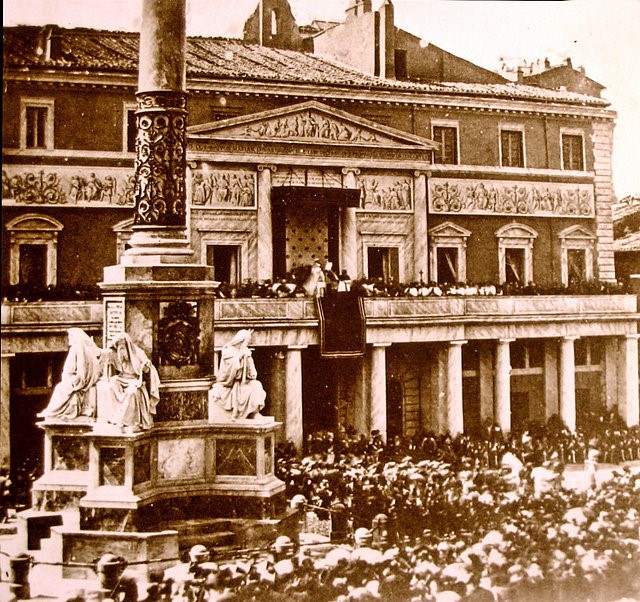 El monumento se levantó el año 1857 y fue inaugurado por el Papa Pío IX en persona, quien, una vez más no por casualidad, lo hizo desde la terraza de la Embajada española.