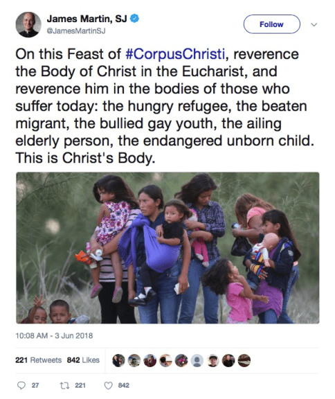 Para aquellos que no pueden ver la captura de pantalla, esto es lo que Martin dice: «En esta fiesta de #Corpus Cristi, reverencien el Cuerpo de Cristo en la Eucaristía, y lo reverencien en los cuerpos de los que sufren hoy: el refugiado hambriento , el migrante vencido, el joven homosexual intimidado, la persona mayor enferma, el niño en gestación en peligro de extinción. Este es el Cuerpo de Cristo. «(El enlace al tuit real se puede acceder aquí ).