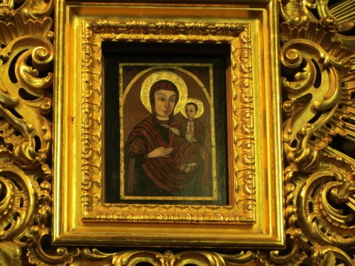 Él pintó a la Virgen Madre sosteniendo al Divino Niño, con cuya mano izquierda sostiene un tulipán de tres pétalos.