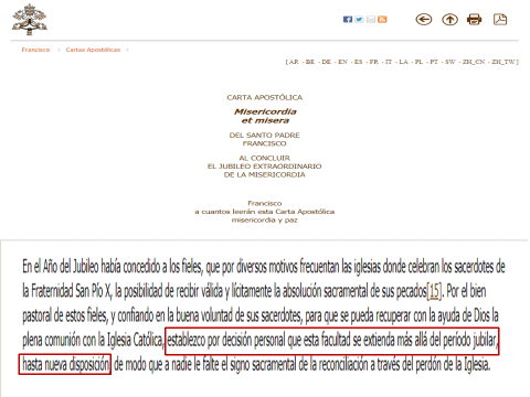 Finalizado ese año, Bergoglio, por la Carta Apostólica Misericordia et misera de 2016, extendió ese permiso “más allá del período jubilar, hasta nueva disposición”.