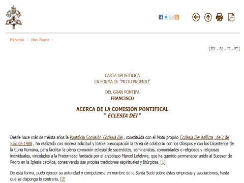 “Considerando que las condiciones que llevaron al “Santo” Pontífice Juan Pablo II a la institución de la Pontificia Comisión Ecclesia Dei han cambiado hoy; tomando nota de que los Institutos y las Comunidades Religiosas que suelen celebrar en forma extraordinaria, han encontrado hoy su propia estabilidad en número y en vida; tomando nota de que los objetivos y cuestiones de que se ocupa la Pontificia Comisión Ecclesia Dei son principalmente de carácter doctrinal; se suprime la Pontificia Comisión Ecclesia Dei , creada el 2 de julio de 1988 con el Motu Proprio Ecclesia Dei aflicta”.