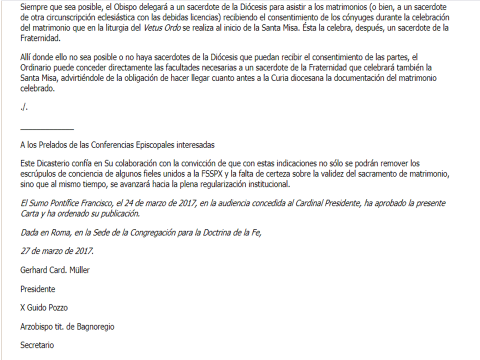 b-Donde esto no sea posible o no haya sacerdotes de la Diócesis que puedan recibir el consentimiento de las partes, el Ordinario podrá conceder directamente las facultades necesarias a un sacerdote de la Fraternidad, que celebrará también la Santa Misa.