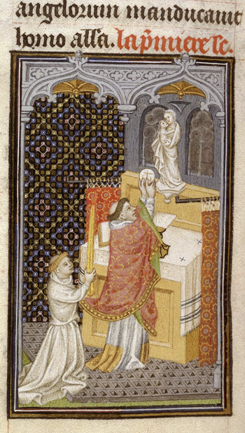 Pero una vez, mientras enfriaba así sus dedos gotosos, escuchó la voz desde el hielo. Le ordenó que dijera quién o qué era. La respuesta fue: «Soy un alma prisionera en el hielo y afligida por mis pecados. Seré liberado de aquí, si me dijeras 30 misas en 30 días consecutivos sin interrupción».