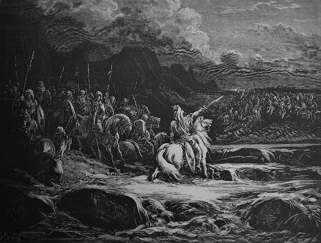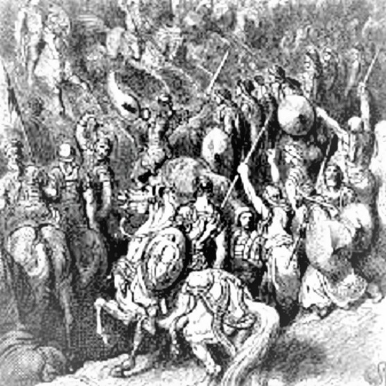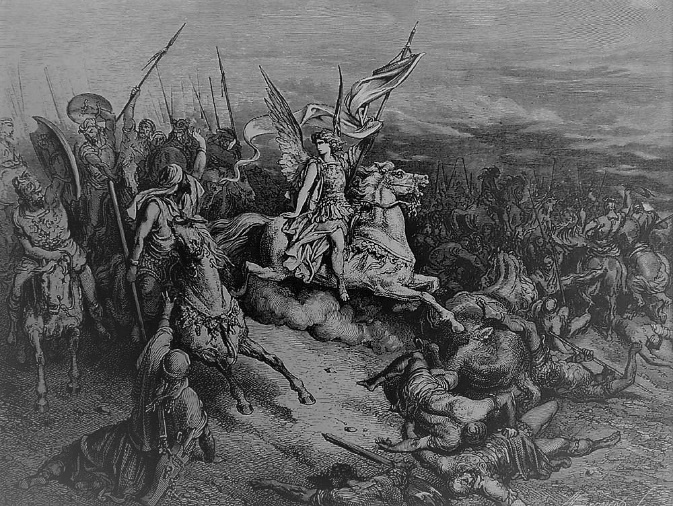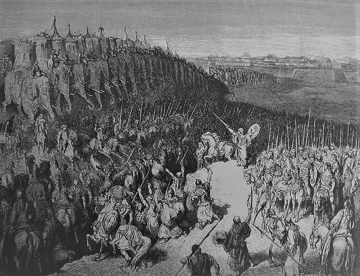 Mas así que se hizo de día, se dejó ver Judas en el llano, acompañado tan solamente de tres mil hombres, que se hallaban faltos de espadas y broqueles; y reconocieron que el ejército de los gentiles era muy fuerte, y que estaba rodeado de coraceros y de caballería, y que todos eran diestros en el combate.