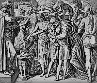 Se encendió el rey en cólera, y mandó que se pusiesen sobre el fuego sartenes y calderas de bronce. Así que cuando éstas empezaron a hervir ordenó que se cortase la lengua al que había hablado el primero, que se le arrancase la piel de la cabeza, y que se le cortasen las extremidades de las manos y pies, en presencia de sus hermanos y de su madre. Estando ya así del todo inutilizado, mandó traer fuego, y que le tostasen en la sartén hasta que expirase.