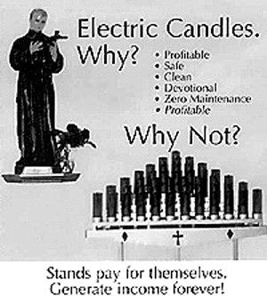 ¿Y la vela votiva? El anuncio de la imagen muestra que también ha encontrado una interpretación moderna: la vela eléctrica. ¿Por qué? Porque, según explica el anuncio, son seguras, limpias, sin mantenimiento, ah…, y por supuesto rentables, con un poco de énfasis adicional en el último adjetivo.