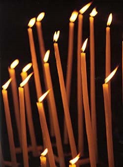 Encender una vela implica un pequeño ritual: primero, encender un fósforo; con él encender el pabilo largo y delgado; mediante él, la llama pasa a la mecha de la vela en la lámpara votiva de vidrio. La mecha se enciende y comienza un pequeño drama litúrgico.