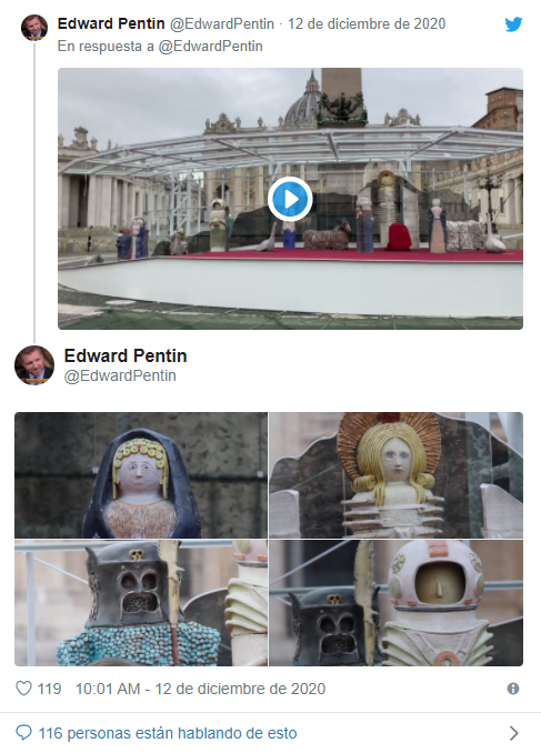 “… El historiador de arte británico Joseph Shaw dijo a Church Militant que ‘la escena de la cuna de este año no es algo ante lo que nadie pueda rezar, sin embargo: es anti-devocional. Solo podemos esperar que se olvide rápidamente ‘”.