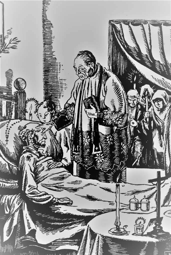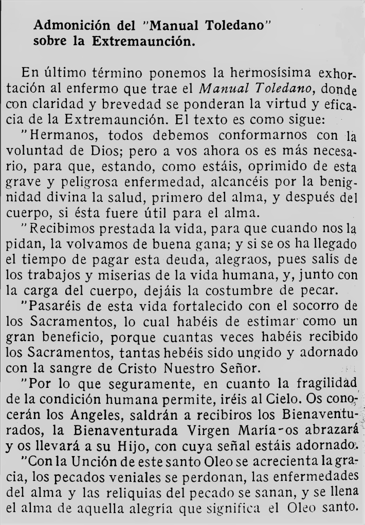 Si, a pesar de la tierna solicitud de la Iglesia y de los deudos para salvar al enfermo, entra éste por fin en la agonía, el sacerdote va de nuevo a su cabecera para sostenerlo en su última lucha, para arrullar con dulces oraciones su postrer sueño y para ponerlo, como quien emprende un peligroso viaje, bajo la dirección de guías fieles y al resguardo de una escolta invisible.
