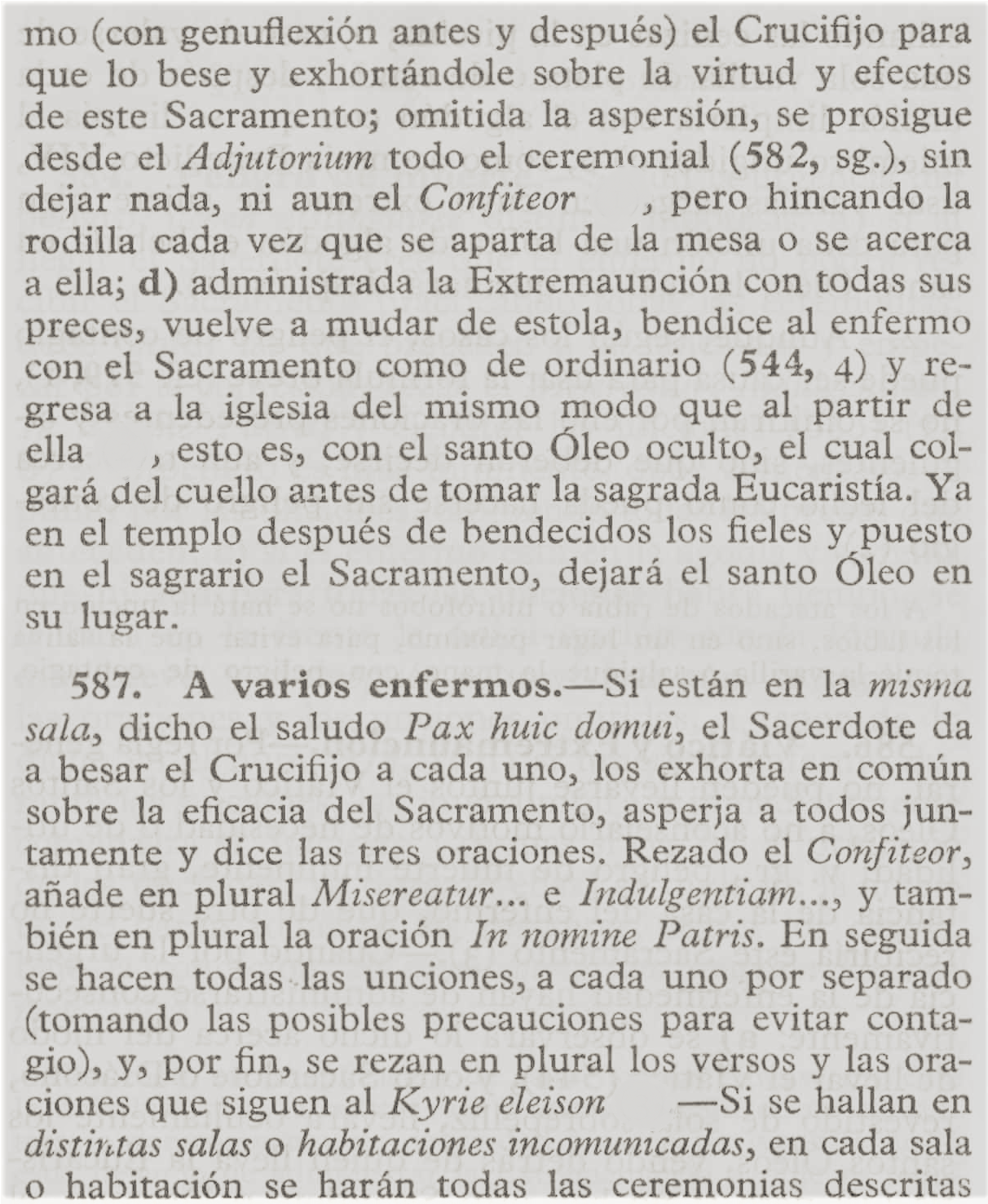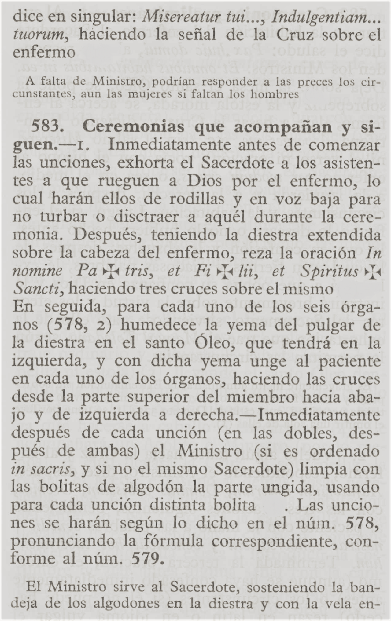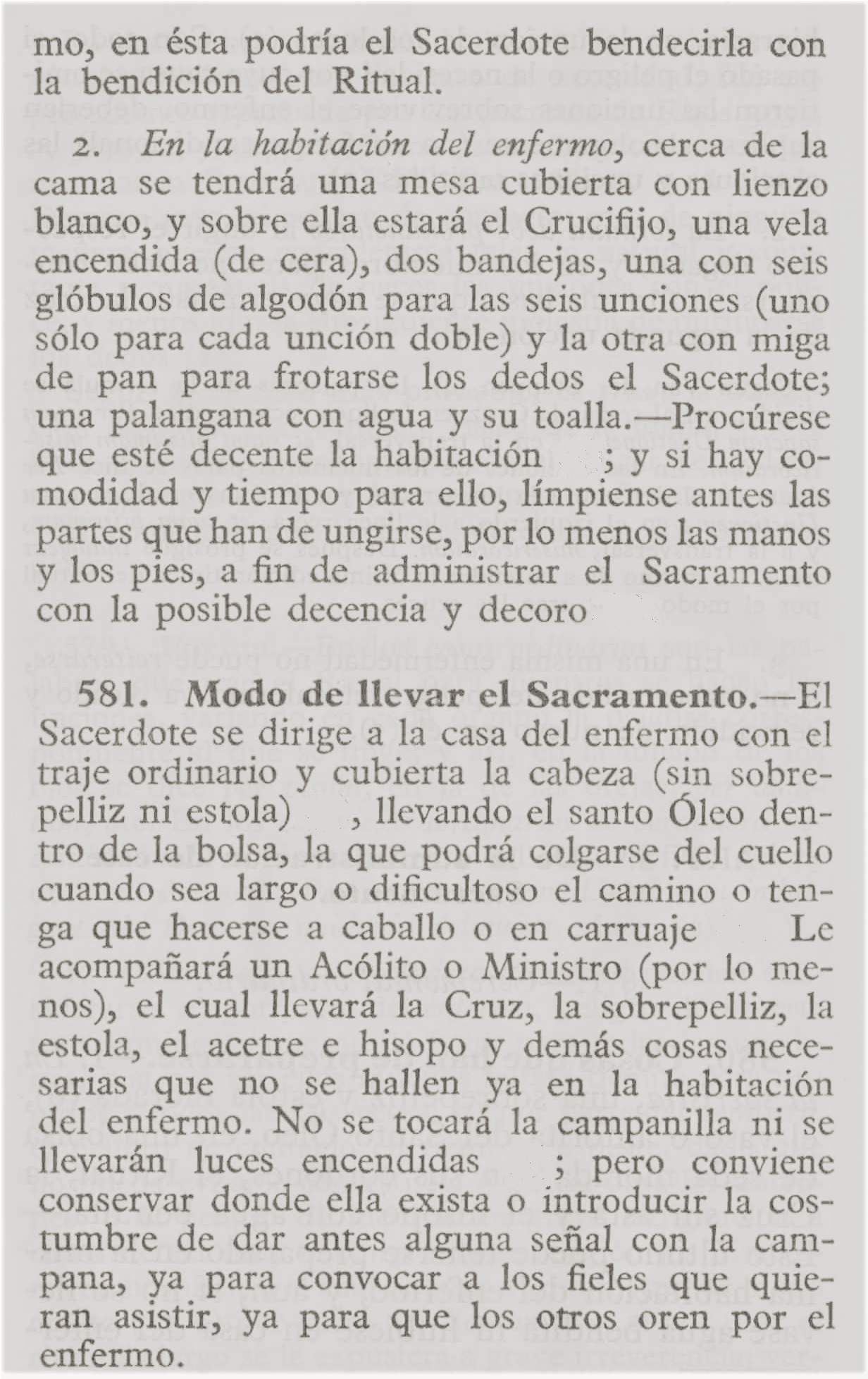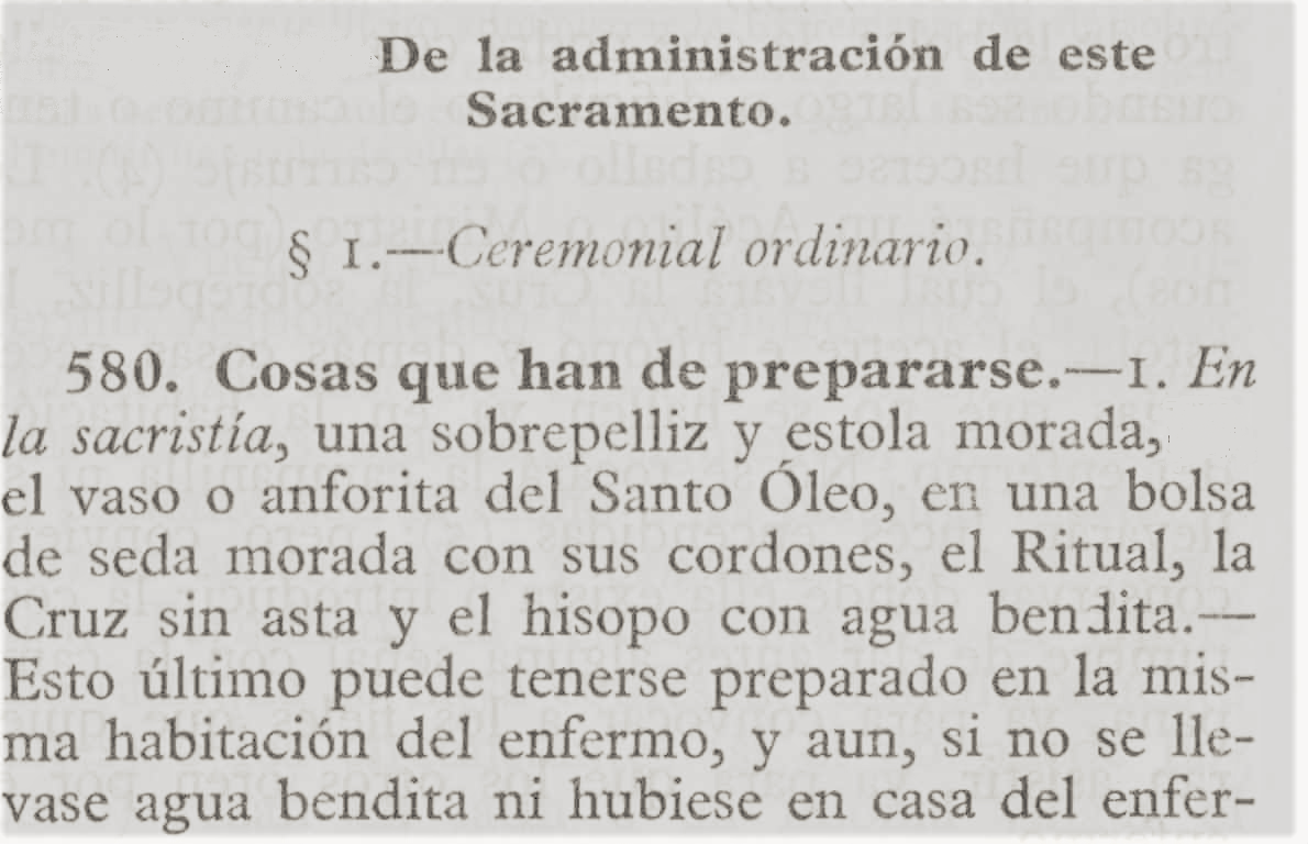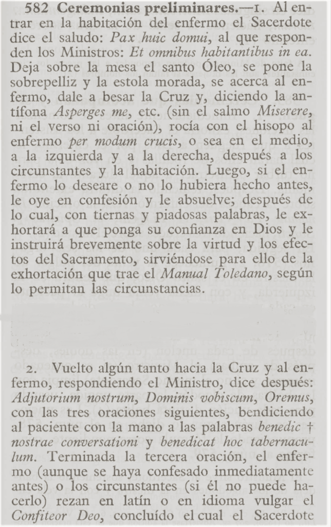 Revestido el sacerdote con sobrepelliz y estola morada, entra donde está el enfermo con el saludo de la paz; le da a besar el crucifijo; lo rocía con agua bendita, así como a la habitación y a los circunstantes; lo confiesa y absuelve, si él lo pide; le instruye brevemente acerca de la virtud y eficacia de este Sacramento y, si es necesario, lo alienta y consuela con la esperanza de la vida eterna.