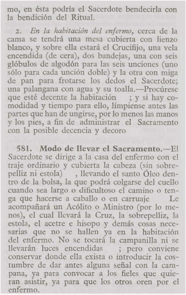 Según el Ritual Romano, en la habitación del enfermo ha de prepararse: una mesilla cubierta con un mantel blanco; un platillo con algodón en rama, para limpiar las partes ungidas; migas de pan y agua, para que el sacerdote se lave las manos; y un cirio encendido; procurando, además, que todo se haga con la mayor pulcritud posible.