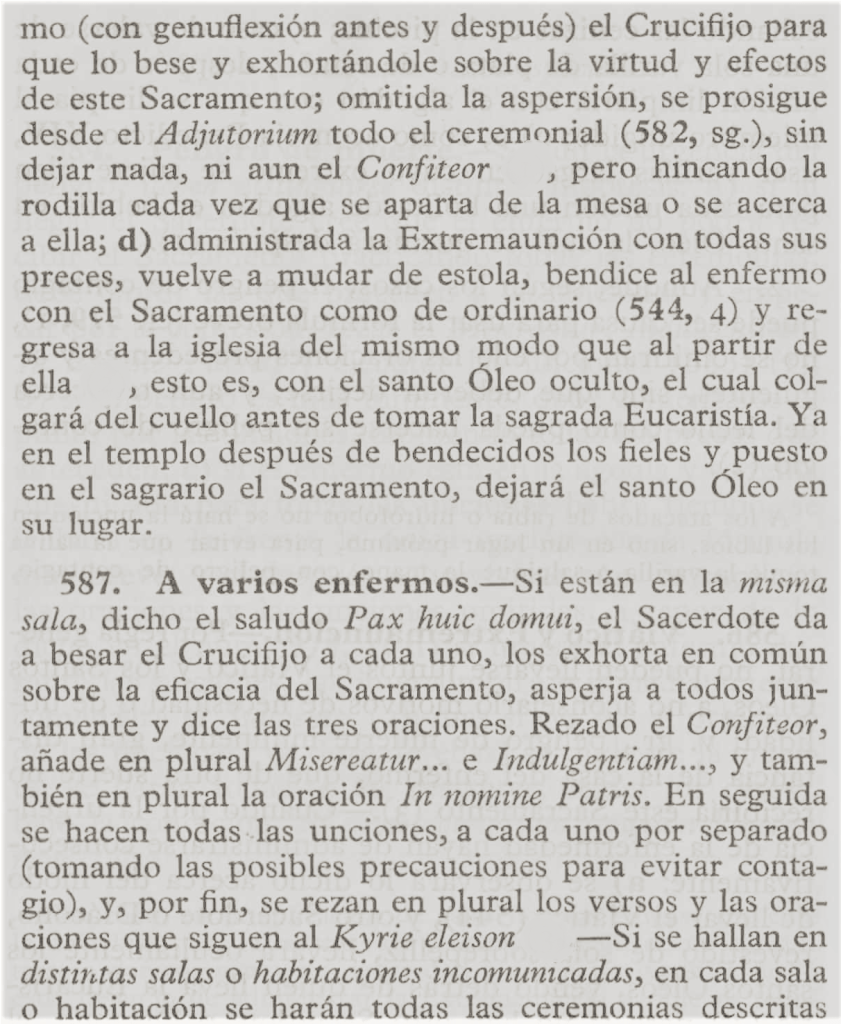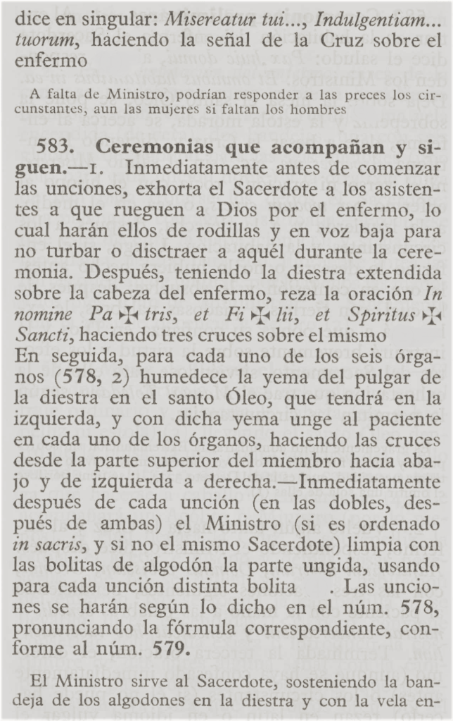 Previas unas cuantas oraciones y el acto de contrición, el sacerdote absuelve al enfermo, y, mientras los asistentes rezan por él los Salmos Penitenciales, las Letanías de los Santos u otras preces apropiadas, le impone las manos sobre la cabeza y lo bendice en el nombre de la Santísima Trinidad.