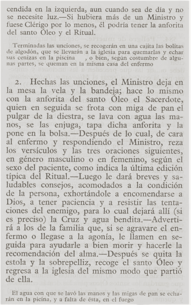 Antes de despedirse, el sacerdote da al enfermo oportunos consejos, deja a su alcance el crucifijo y el agua bendita para que los use devotamente, y amonesta a los deudos que, si se agrava y entra en agonía, llamen al párroco para que lo ayude a bien morir.