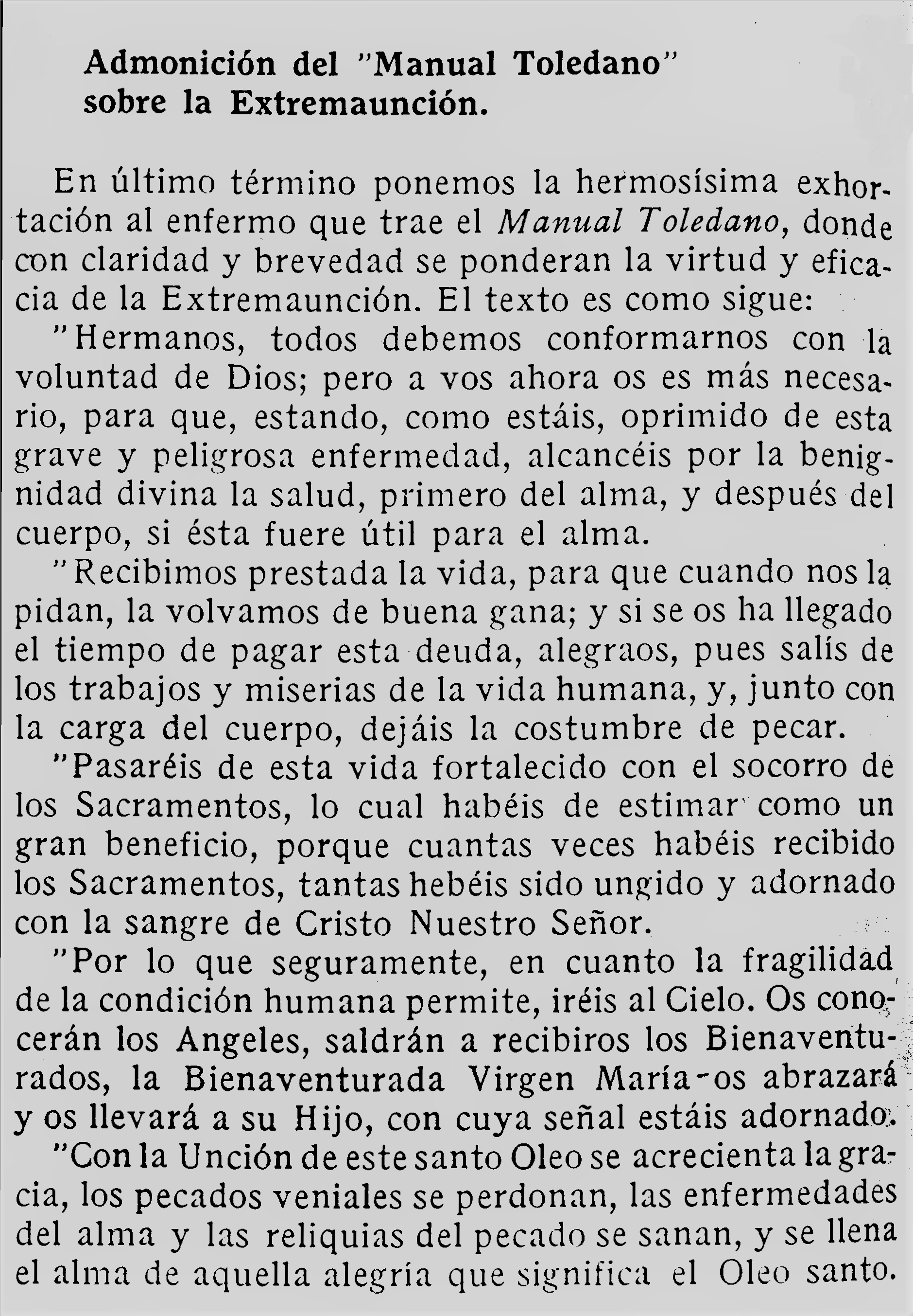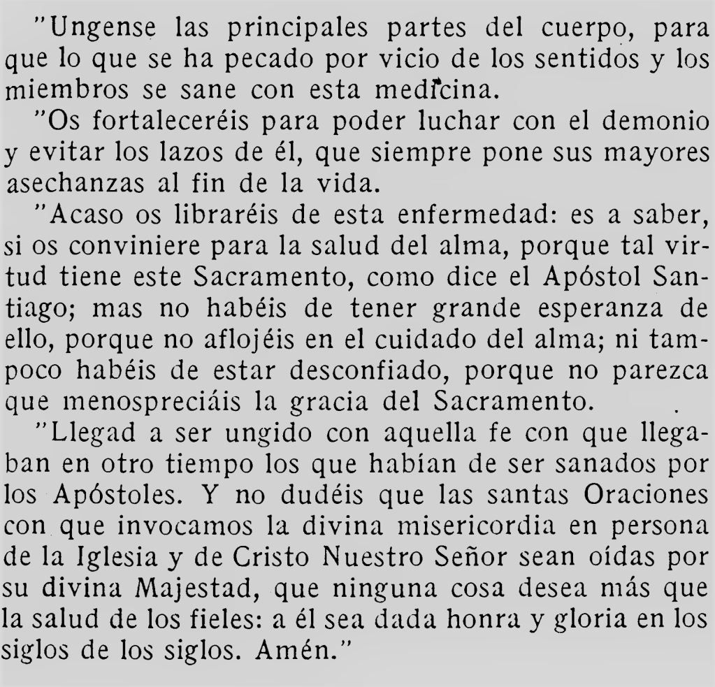 Si el enfermo (y nótese que no decimos el moribundo) se entrega con confianza a la acción, espiritualmente purificadera y corporalmente restauradora de la extremaunción, experimentará en el alma la sensación del más absoluto perdón y quizás vea en el cuerpo restablecida su amenazada salud.