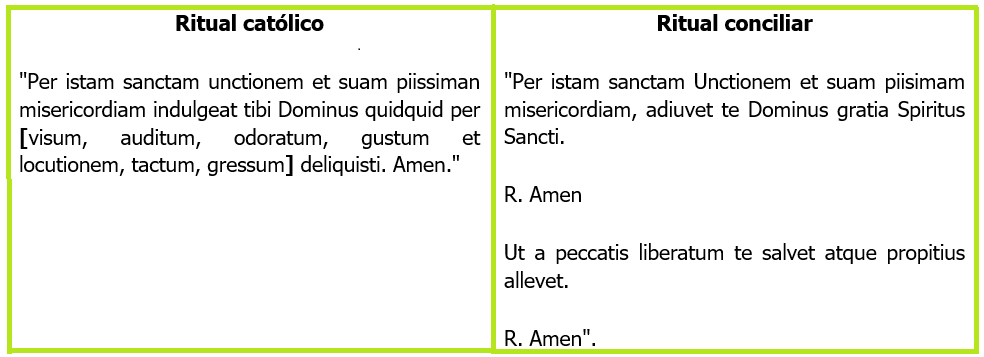 «La primera parte de la fórmula está tomada de aquella romana en uso a partir del siglo XIII (…) El resto está inspirado en el Concilio de Trento y en la epístola de Santiago».