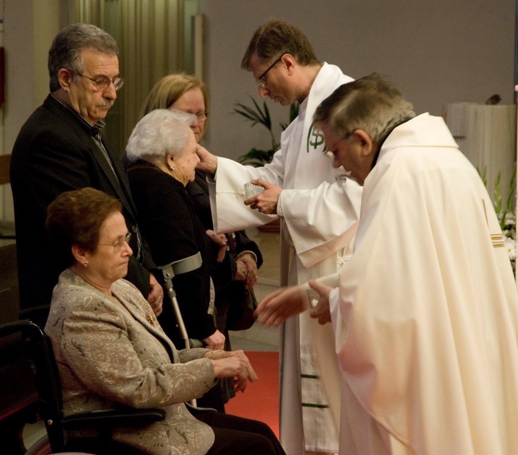 Sacerdote: Muéstrate propicio, Señor, y santifica con tu bendición este aceite, que va a servir de alivio en la enfermedad de tu hijo, y por la oración de nuestra fe libra de su enfermedad a quien ungimos con el óleo. Por Jesucristo nuestro Señor.