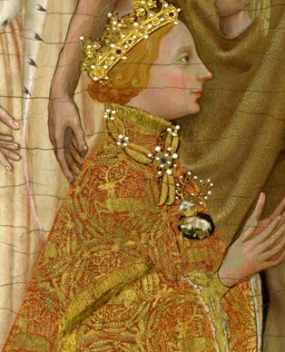 Ahora bien, si miramos de cerca la rica túnica exterior de bermellón rojo del joven Rey, a la izquierda, encontramos que la tela está bordada con ciervos dorados. Un broche con un ciervo blanco, el emblema heráldico de Ricardo II, también sujeta la túnica en el centro.