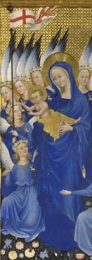 El Rey Ricardo II es presentado a Nuestra Señora y al Niño Jesús por sus santos patrones: San Juan Bautista, con su símbolo del Cordero de Dios; Eduardo el Confesor, con el anillo que le dio a un pobre peregrino, que en realidad era San Juan Evangelista; y Edmundo Mártir, sosteniendo la flecha que lo mató.