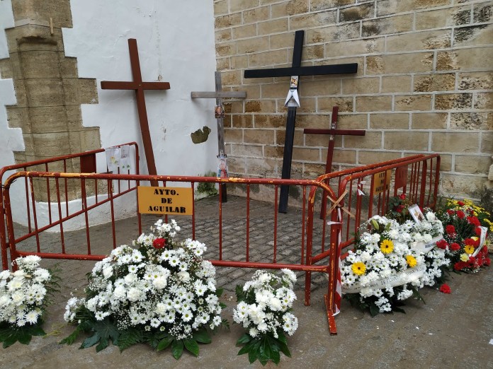 La reacción de la gente de Aguilar de la Frontera ante el derribo de la Cruz no se hizo esperar y, en el espacio en el que se encontraba dicha Cruz, han depositado cruces de madera de diferentes tamaños y ramos de flores con mensajes.