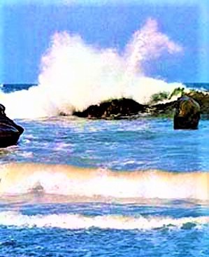 A medida que cada ola magnífica se eleva y alcanza su cenit, se riza para golpear las rocas y la arena como la brillante cimitarra oriental; a medida que la ola se arremolina hasta su punto más alto, al espectador le parece que está en su punto más dinámico.