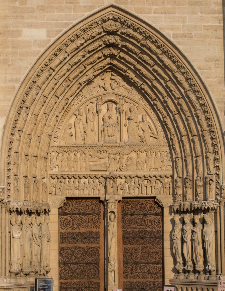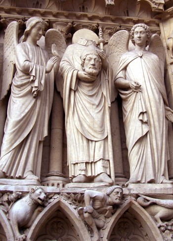 Aunque en Notre Dame de París ningún pórtico estaba completamente dedicado a las imágenes de los Santos de la Isla de Francia, varias estatuas grandes y algunos bajorrelieves notables hicieron imposible que la gente de París olvidara a San Denis, el Obispo de París, que fue martirizado al ser decapitado por una espada en la colina más alta de París (hoy Montmartre).