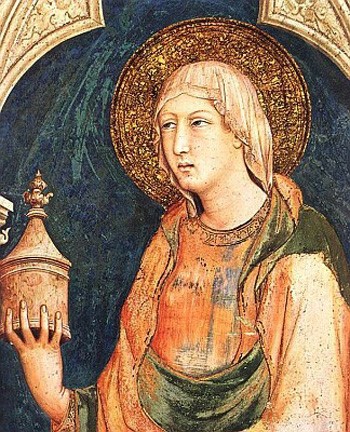 Santa María Magdalena, Patrona de los perfumistas, con el perfume que derramó sobre los pies de Nuestro Señor.