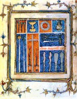 La escalera, una a cada lado de la Cruz, se utilizó en el Descenso. Descansando sobre los brazos de la Cruz de Cristo hay dos símbolos muy comunes: el martillo que se usa para clavar los clavos en la Carne inocente de Nuestro Señor y las tenazas, que se usaron para sacarlos después de su Muerte. Rara vez un manuscrito que representa símbolos de tortura omite estos símbolos.