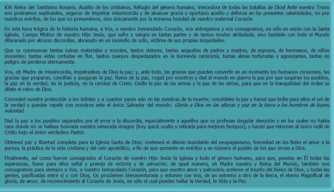 “Nos, por tanto, para que Nuestras oraciones y las vuestras sean escuchadas más fácilmente y para daros una prueba especial de Nuestra particular benevolencia, lo mismo que hace pocos años consagramos todo el mundo al Corazón Inmaculado de la Virgen Madre de Dios, así ahora, de manera especialísima, consagramos todos los pueblos de Rusia al mismo Corazón Inmaculado, en la firme confianza de que, con el poderosísimo patrocinio de la Virgen María, se realizarán cuanto antes los votos que Nos, vosotros, y todos los buenos formulan por una verdadera paz, por una concordia fraternal y por la debida libertad para todos y en primer lugar para la Iglesia; de forma que, mediante la oración que Nos elevamos junto con vosotros y con todos los cristianos, el Reino salvador de Cristo, que es el “Reino de verdad y de vida, Reino de santidad y de gracia, Reino de justicia, de amor y de paz” triunfe y se consolide establemente en todas las partes de la tierra”.