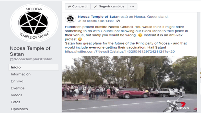 Por su parte la logia satánica “Nossa Temple Of Satán” publico en su muro de Face Book: “Cientos de personas protestan frente al Ayuntamiento de Noosa. Pensarías que podría tener algo que ver con el Ayuntamiento para que no permita que nuestra Misa Negra se lleve a cabo en su lugar, pero, lamentablemente estas equivocado. En cambio, es una protesta anti-vax.