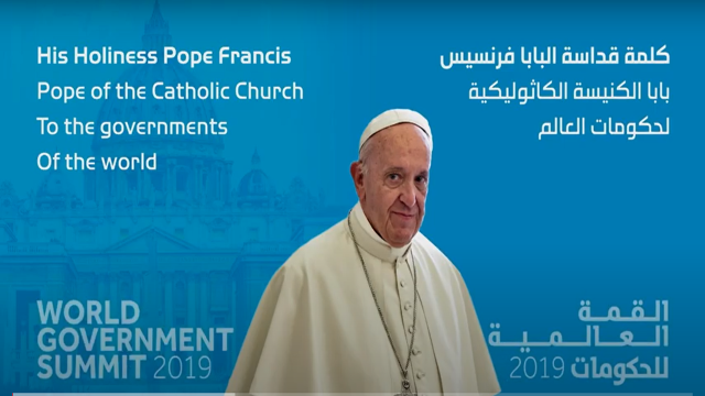 El Pseudoprofeta Francisco saludó a los participantes en la Cumbre del Gobierno Mundial en Dubái, Emiratos Árabes Unidos, de 2019, con un mensaje en vídeo.