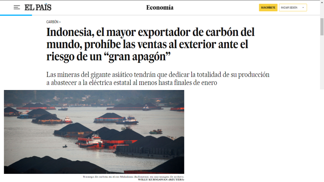 Por su parte, el Gobierno de Indonesia, el mayor exportador de carbón para uso energético del mundo, ha prohibido este sábado las exportaciones de este mineral por miedo a no poder abastecer el mercado interno para la generación de electricidad. Al menos hasta finales de enero, las mineras del gigante asiático tendrán que dedicar toda su producción a garantizar que haya suficiente carbón para alimentar las plantas térmicas que aportan más del 60% de la electricidad que consume la cuarta nación más poblada del mundo y una de las 10 mayores emisoras de gases de efecto invernadero.